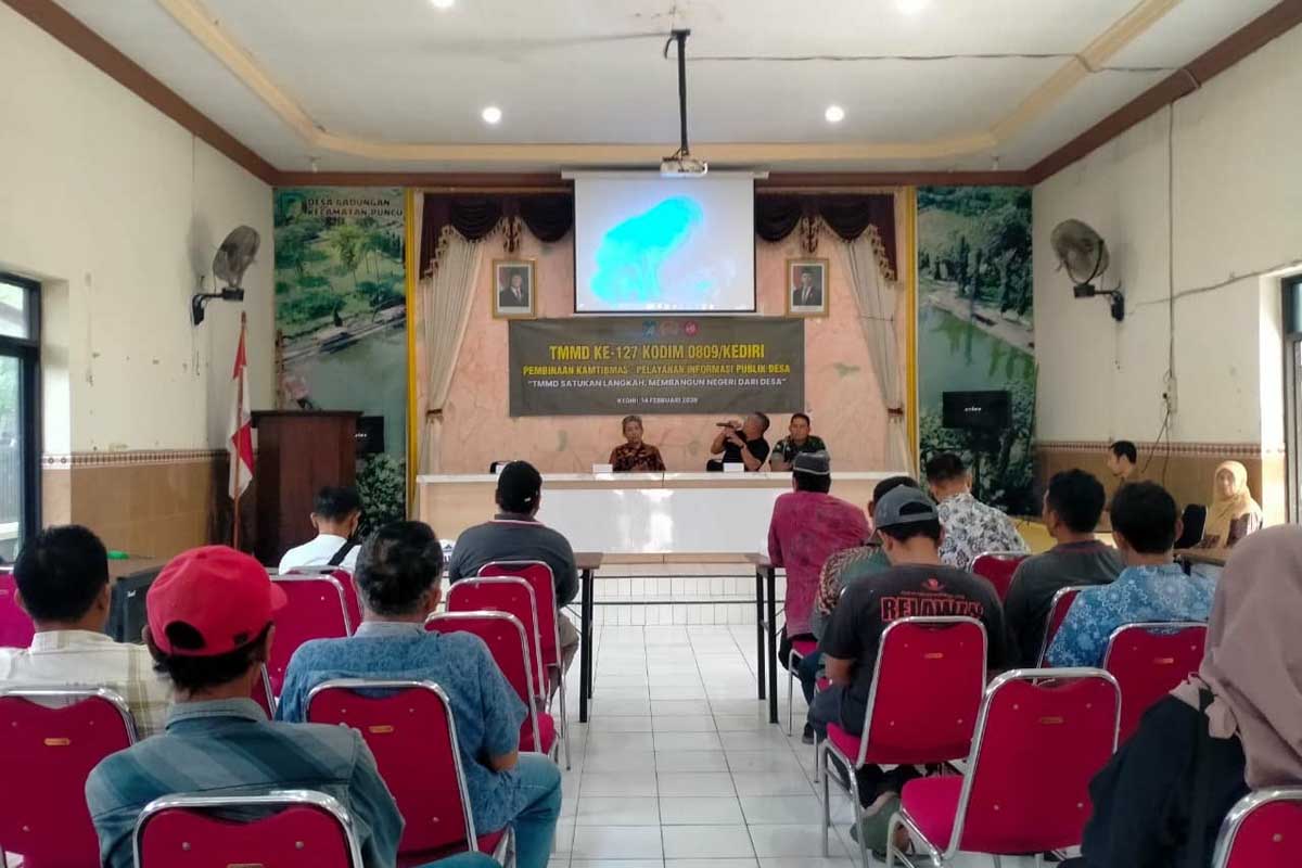 Foto: TMMD ke-127menggelar pembinaan keamanan dan ketertiban masyarakat (Kamtibmas) di Balai Desa Gadungan, Kecamatan Puncu, Kabupaten Kediri, Sabtu (14/2/2026).